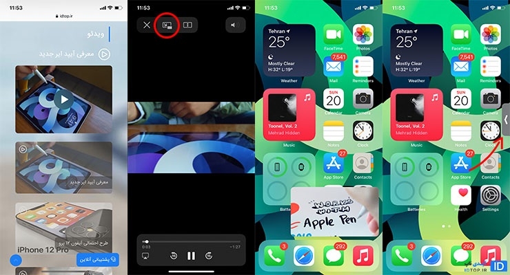 پس از معرفی iOS 14 کاربران آی او اس در زمان تماشای یک فایل ویدیویی باید تا اتمام ویدیو در آن نرم افزار یا سایت می ماندند و امکان اینکه ویدیو رو به شکل کوچک در بخشی از صفحه نمایش مشاهده کرد وجود نداشت، زبان طراحی جدید اپل این امکان را به آیفون اضافه کرده است، کاربران می توانند با انتخاب گزینه مربوطه ویدیو خود را به شکل متفاوتی در هرجای صفحه قرار داده و به کار های دیگر بپردازند، همچنین امکان پنهان کردن ویدیو در کناره های صفحه نمایش وجود دارد.
