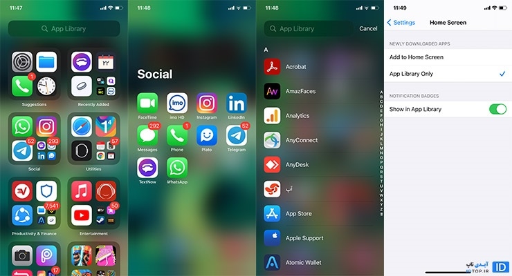اضافه شدن اپ لایبری به آیفون سبب شده که یک منو جدید در Setting مشاهده شود، نام این بخش Home Screen بوده و با وارد شدن به آن می توانید مشخص کنید که نرم افزار هایی که جدید دانلود می شوند مستقیم به اپ لایبری منتقل شود یا در صفحه اصلی، همچنین امکان نمایش و عدم نمایش تعداد اعلان های هر اپلیکیشن در بخش App Library از این قسمت قابل کنترل است. لازم به ذکر است که اپل در بخش اپ لایبری نیز بخشی برای جستجوی نرم افزار ها در نظر گرفته، امکان جستجو برای کاربرانی که تعداد زیادی نرم افزار نصب دارند، بسیار کاربردی خواهد بود.