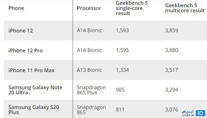 آیفون 12 میتواند تمامی دستگاه های اندرویدی موجود را شکست دهد، تمامی پرچمداران اندروید حتی جدیدترین اسمارتفون گیمینگ ایسوس یعنی Rog Phone 3 با چیپست اسنپدراگون 865 پلاس از آیفون 12 شکست خوردند.